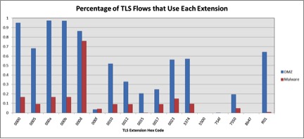Figure 4 shows the TLS extensions that we observed clients advertising. The benign traffic generally had much more variability in the TLS extensions that were supported. The notable exception was the “000d” or signature algorithm extension, which is an RFC MUST in most situations.