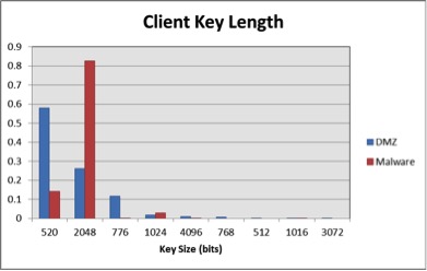 Finally, we looked at the client’s public key length. Figure 5 shows the results. First, it is important to note that the strength of these key lengths depends on the public key algorithm as well as the key length. Elliptic curve cryptography with a 520-bit key is more secure than Diffie-Hellman with a 768-bit key. What our data suggests is that benign traffic uses 520-bit ECC for most of the TLS sessions while malware mostly uses 2048-bit DH.