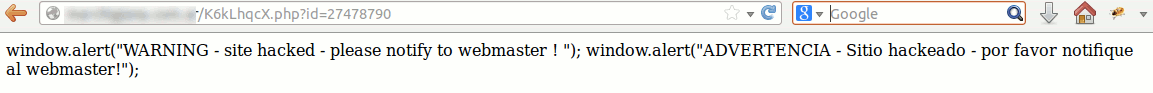 Two comments containing a hexadecimal colour reference flank an instruction to the browser to download JavaScript from a PHP file on a second compromised website. The name of this PHP file always follows the same pattern: 8 mixed case alpha numeric characters with a parameter accepting an eight digit id value. The PHP file only responds once per ID value. If accessed more than once, the page returns a 403 forbidden error, otherwise malicious JavaScript is returned to be executed in the visitor’s browser.