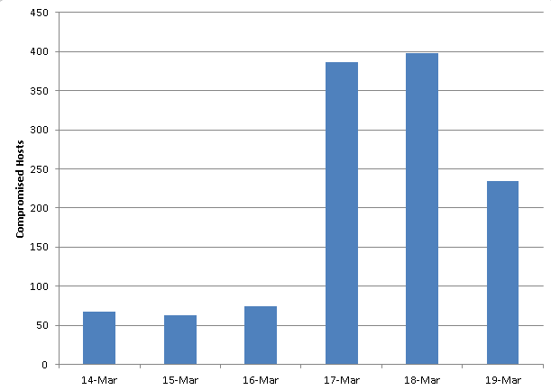 The speed of spread of this attack has been dramatic, with almost 400 distinct hosts being affected each day on March 17 & 18.