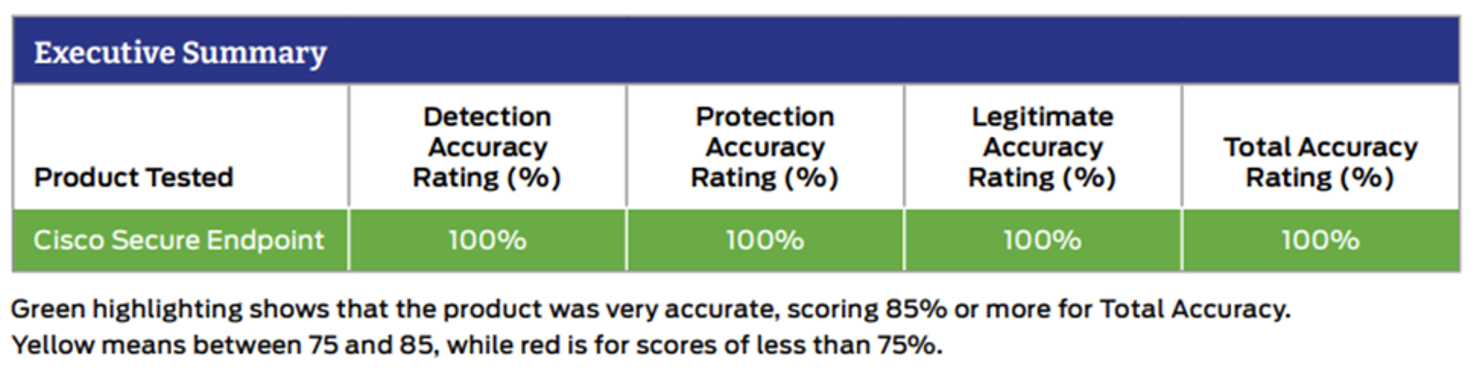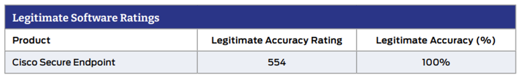 Cisco Secure Endpoint also scored a 100% Legitimacy Accuracy Rating, meaning that it correctly identified harmless and legitimate software and allowed them to run without engaging administrators or end-users in sub-optimum interactions.