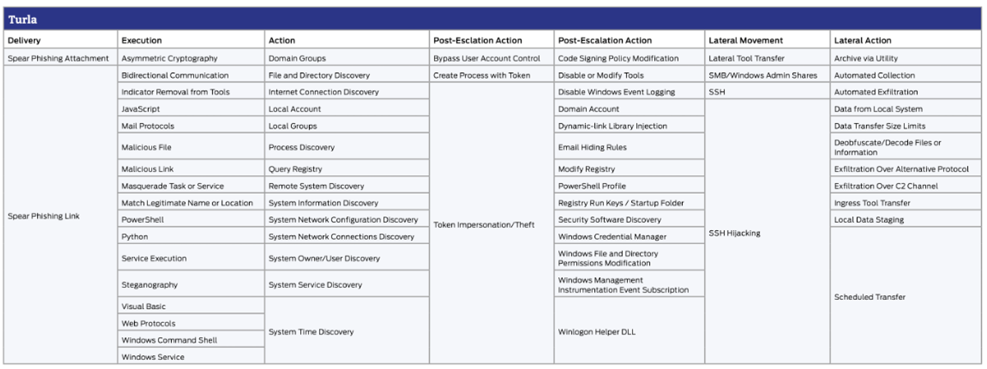 Turla is a Russian-based threat group known for conducting watering hole and spear phishing campaigns and leveraging in-house tools and malware. Targets range from nation-states, governmental organizations, educational institutes, and private organizations. Turla primarily targets Windows platforms, however, macOS and Linux machines have been compromised as well.