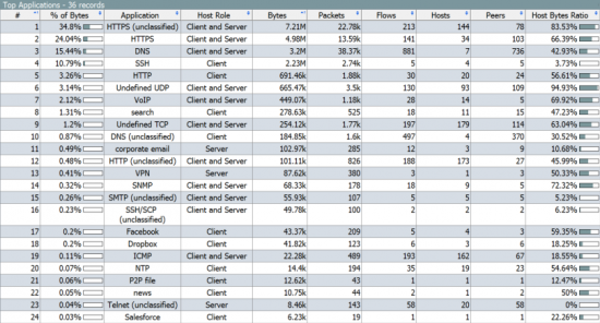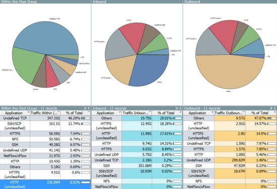 Stealthwatch Enterprise provides layer 7 visibility, which allows users to see application and service usage in a variety of formats. Here is an example summary of a network environment’s application traffic, visualized as a pie chart: