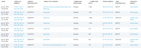 In the example below, traffic utilizing peer-to-peer (P2P) or Dropbox is identified:
