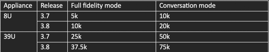 The release 3.8 software has optimized the appliances performance and supporting 50-100% greater number of workloads on same hardware. This means the existing customers with M5 appliances now can support almost double the number of workloads in the existing investment of their appliances. The TCO (Total Cost of Ownership) for existing customers reduces with the new workload capacity numbers. The new and old numbers of supported workloads are as below.