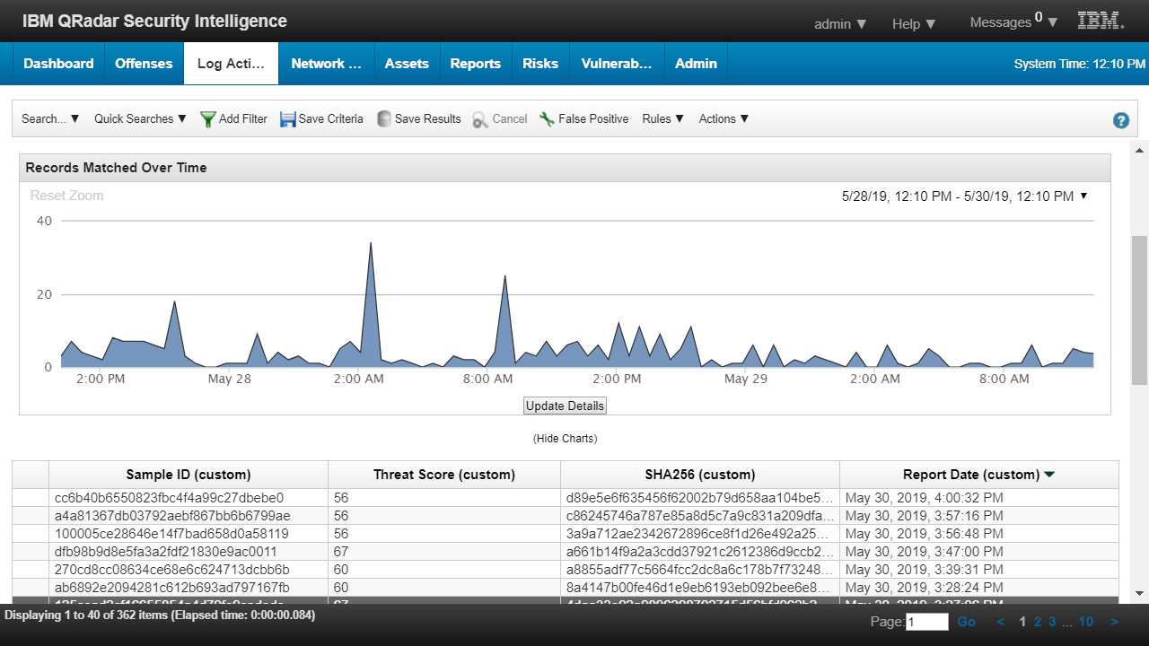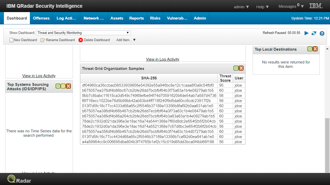 Detailed results from the sandbox analysis of Threat Grid can be aggregated by QRadar to determine whether the potential threats within the organization are malicious or benign. Malware samples are then assigned a Threat Score, and displayed by hash value and the user which submitted the sample.