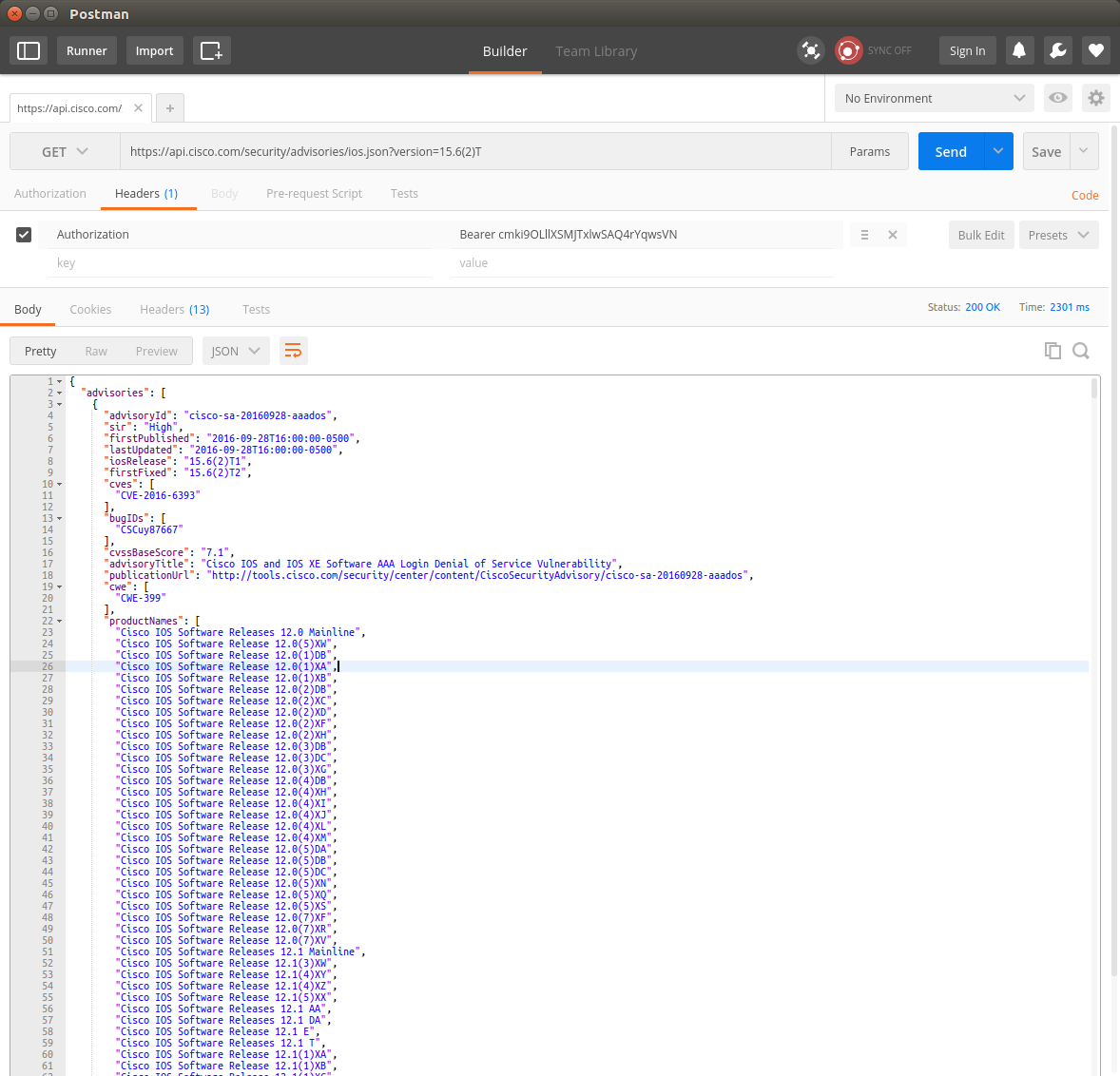 The following figure illustrates an API call to query all advisories that affect Cisco IOS Software version 15.6(2)T using Postman.