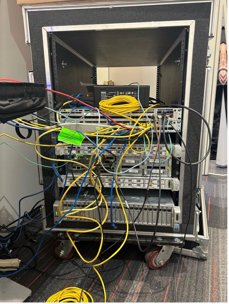 Here is what our custom “SOC in the Box” looked like wired up and fully operational, connected to the Moscone NOC and NetWitness Platform. We have room for NetWitness appliances and their 140TB of storage for those network packets.