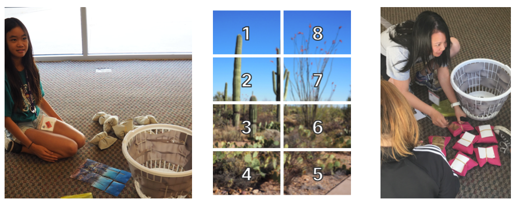 Left: Student playing the grey endpoint reassembles her photo message Center: Photos are cut and numbered for Round 1’s fragmentation and reassembly lesson Right: I demonstrate how to attach messages to beanbags for different lessons