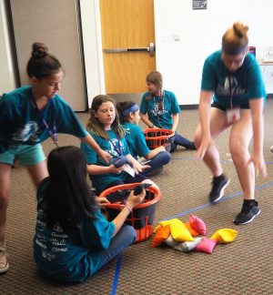 In Pitching Packets, laundry baskets represent the major components of the network (core routers, home or access routers, and endpoints). To set up the game, create a network diagram by connecting baskets with routes, represented with colored tape between baskets. While the color of the core and access routers doesn’t matter, the colors of the endpoint baskets represent their address. The network topology is also irrelevant, but the size of the network depends on how many participants are available each game.