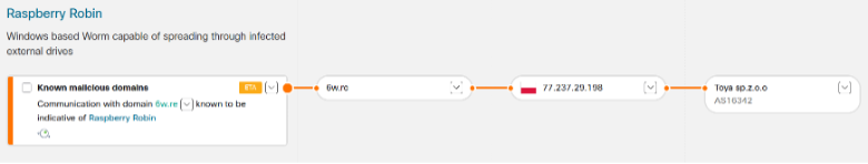 In Cisco Global Threat Alerts available through Cisco Secure Network Analytics and Cisco Secure Endpoint, we track this activity under the Raspberry Robin threat object. Image 3 shows a detection sample of Raspberry Robin: