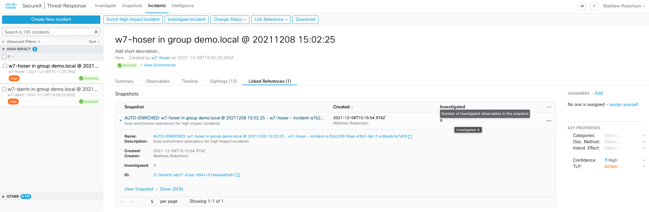 Once it has finished enriching, if we click on the top Incident in the High Impact Incident list and then on Linked References, we can see the Snapshot that was created during the enrichment process and that there were nine different observables investigated across multiple data sources integrated with SecureX Threat Response.