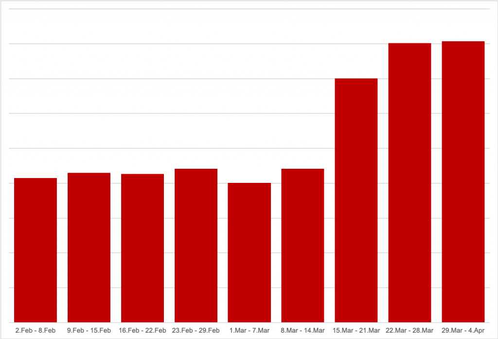 In mid-March, we can see a marked increase in remote connections. While it’s interesting to note an inverse correlation between office-based connections to Umbrella (declining) and remote connections (increasing), even more interesting is by how much remote connections increased.