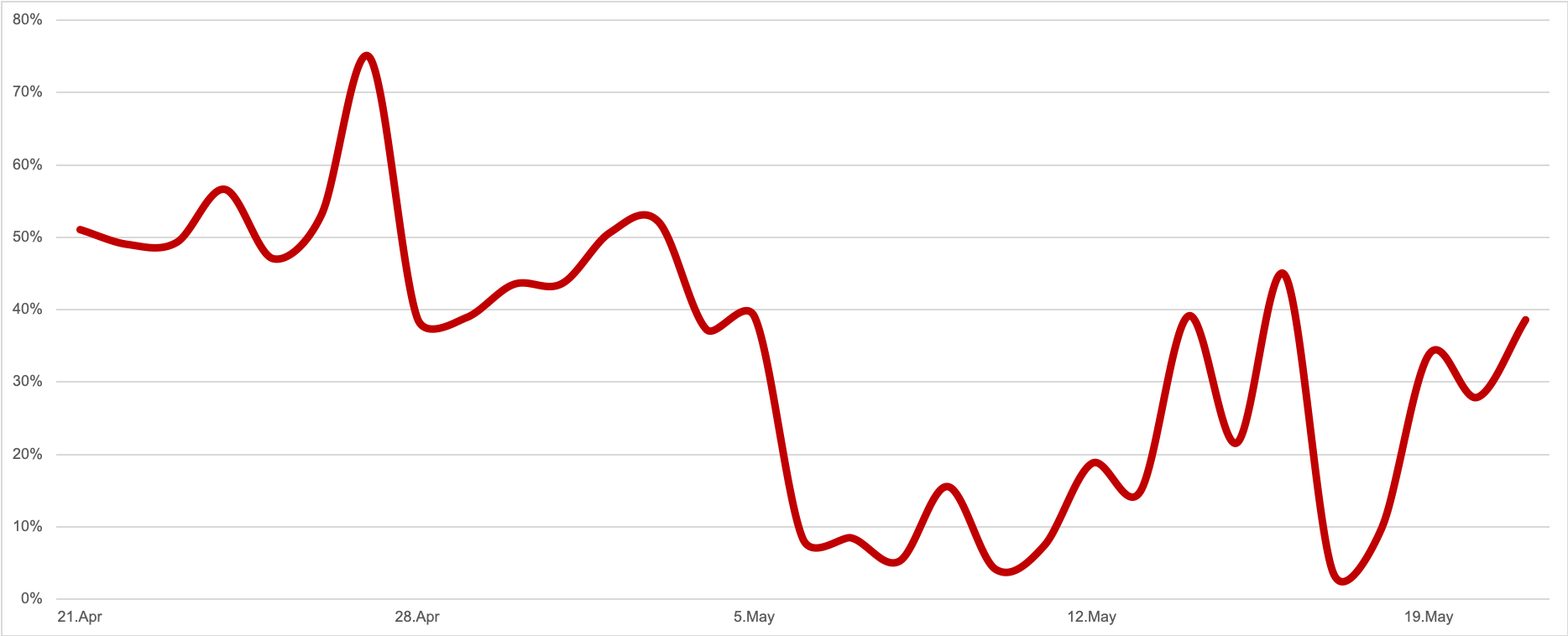 Despite this being a marked increase from March, late April appears to be the point where the most malicious activity took place. During this time the percentage of domains blocked as malicious frequently crossed 50 percent, even peaking as high as 75 percent. While this declined in early May, the percentage of malicious domains regularly sat between 30-40 percent in mid- to late-May.