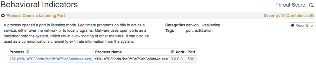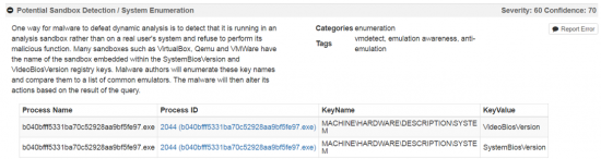 Because Threat Grid has no instrumentation or hooks into the virtual environment, there is no presence to indicate to the samples that they are in a sandbox environment, in fact checking for that is an additional behavior upon which to alert.
