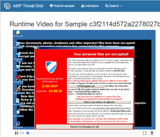 Unlike the Wild West of BlackHat, attendees in general were not using the network as an attack platform. However, very malicious samples were discovered as they were downloaded into the network, including this ransomware sample. The full PCAP of the command and control communication between the sample and the attack servers was automatically analyzed with SNORT rules as well, resulting in the SNORT alert tags.