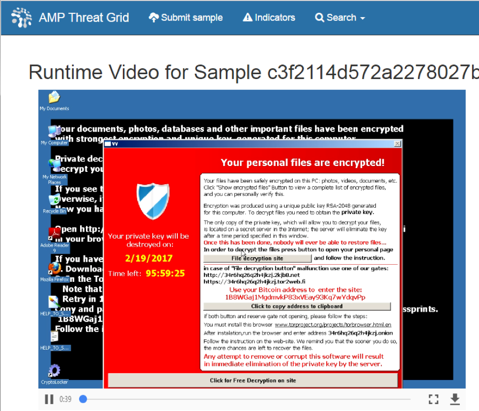 The SOC team placed NetWitness Packets into Continuous monitoring mode, where .exe, .dll and other potentially malicious payloads were carved out of the network stream and underwent Static analysis, Network intelligence and Community lookup; before sent to Threat Grid for additional static and dynamic malware analysis. Threat Grid provides a ‘Glovebox’ function to safely interact with samples. This was especially useful to click on pop-ups for installers, warning dialog boxes and checks for user interaction.