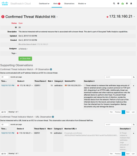 Cognitive Intelligence’s Confirmed Threat Service provides Stealthwatch Cloud with a list of high-confidence Indicators of Compromise (IOCs in the form of IPs and domains), a full description of the related global threat, and a write-up of recommended remediation steps. These IOCs are generated as a result of processing billions of connections from across the globe using a pipeline of analytical techniques which include the collection of Initial Data Packets. In essence, the Confirmed Threat Service is the outcome of multi-layered machine learning and encrypted traffic analytics that can convict known as well as unknown global threat campaigns. Cisco ETA can match field data extracted from the IDP against known IOCs which allows Stealthwatch Cloud to then correlate local customer telemetry to the global Confirmed Threat Service.