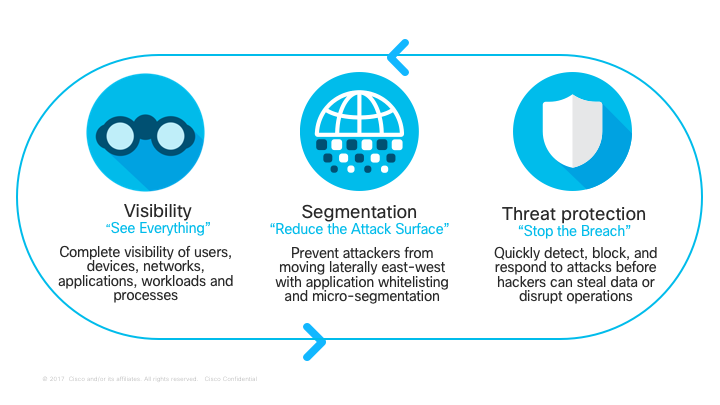 The architecture needs to provide complete visibility, minimise the attack surface and be able to quickly detect, block and respond to threats.[1] The Cisco Secure Data Center Solution, combines the best of our security and data center products, integrated and architected to help organizations achieve greater availability, agility, and performance.