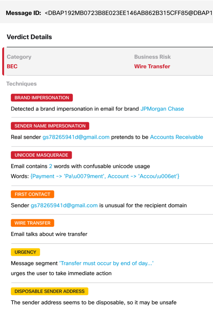 The detection engine granularly identifies specific underlying threat techniques utilized in the message by the attacker. The identified techniques provide the full context of the threat message as the supporting foundation for the engine to determine threat categorization and the specific risk to the business. These malicious Techniques, together with the threat category and specific business risk, are used to populate the Threat Profile.