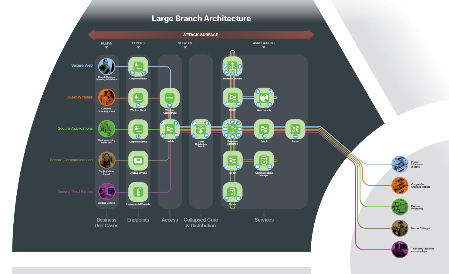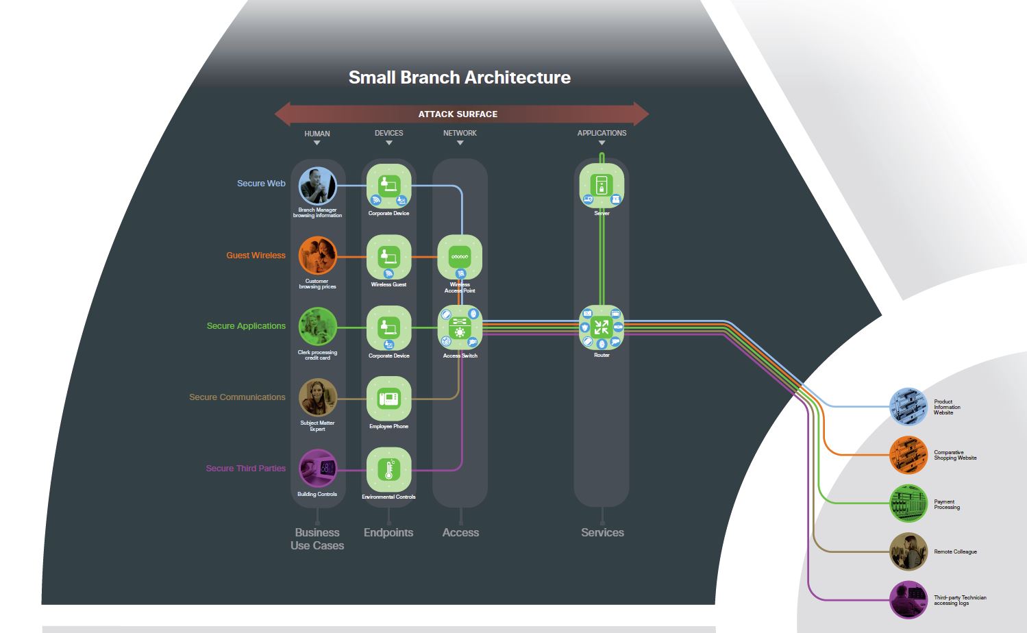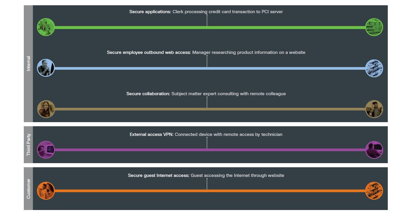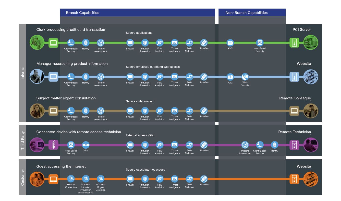 Each of these types of flows have common uses in the branch. To simplify the common branch business risks, we color coded each use case and created an example that can be used for the architecture and design of a secure branch.