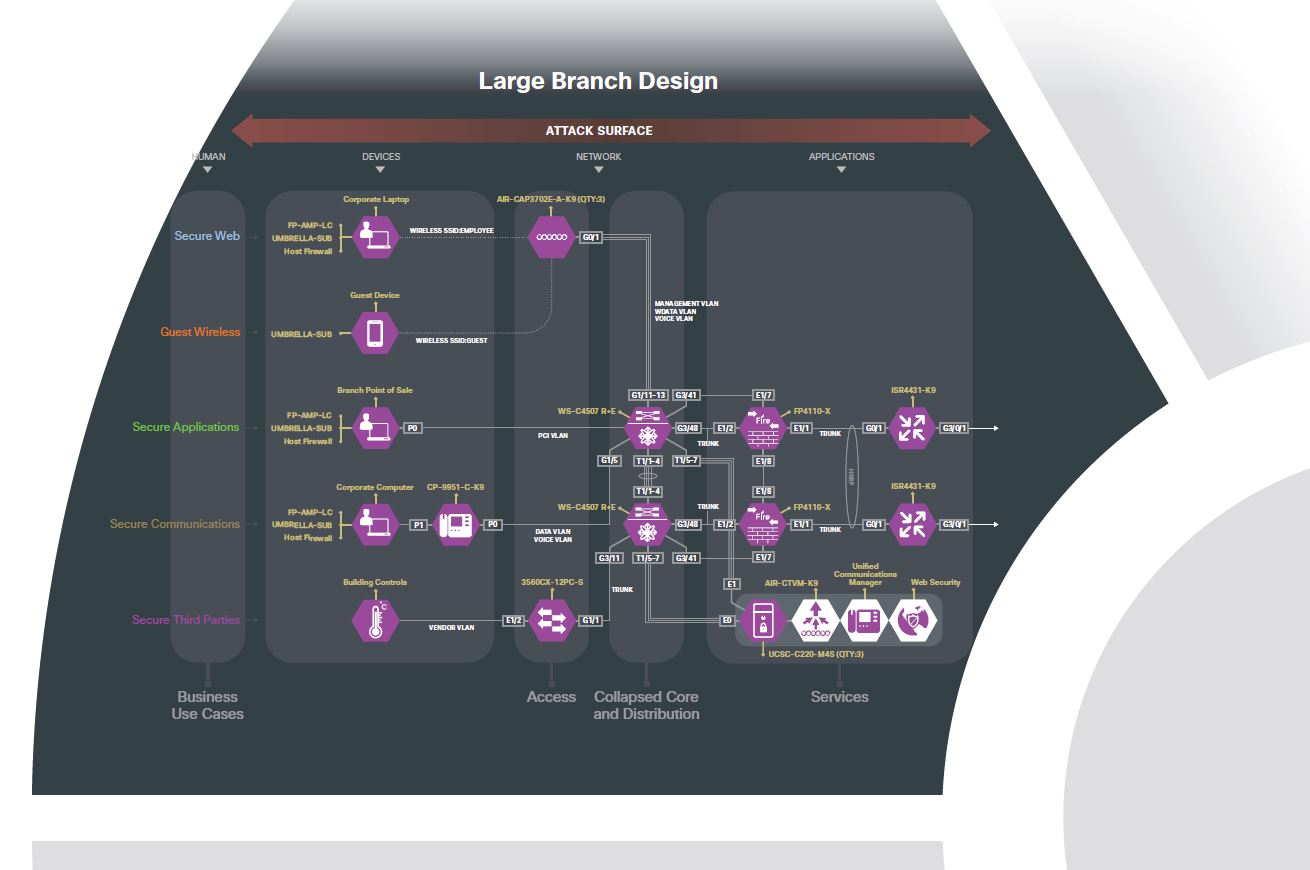 This same mapping of business flows with corresponding security capabilities can be reused for different designs. For example, in contrast to the small branch, perhaps you need a more redundant and available network for your business. In this case, the large branch might be a better fit. It is important to note the same business flows and risks are being secured the same way. Here is an example of the large branch architecture.