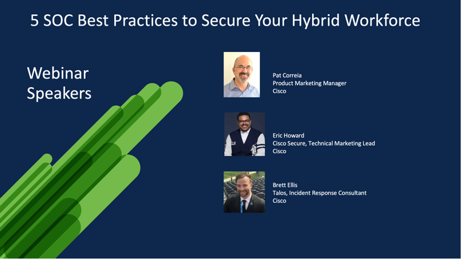 Knowing that not all organizations have this degree of security maturity and preparedness, we gathered a couple of subject matter experts together to discuss 5 areas of time-tested best practices that, besides the advanced tools offered by Cisco and others, can help your SOC (or small security team) yield actionable insights and guide you faster, and with more confidence, toward the outcomes you want.