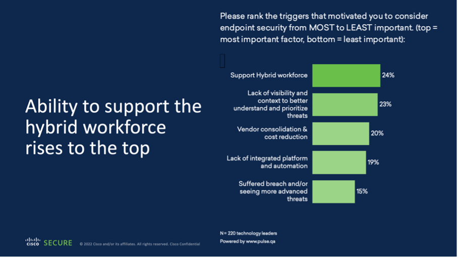 Now with the bulk of many organization’s workers off-premise, the topic of security and the ability of a security vendor to help support an organization’s hybrid workers has risen to the top of the selection criteria. In a soon to be released Cisco endpoint survey, it’s not surprising that the ability of a security vendor to make supporting the hybrid workforce easier and more efficient was the key motivating factor when organizations choose security solutions.