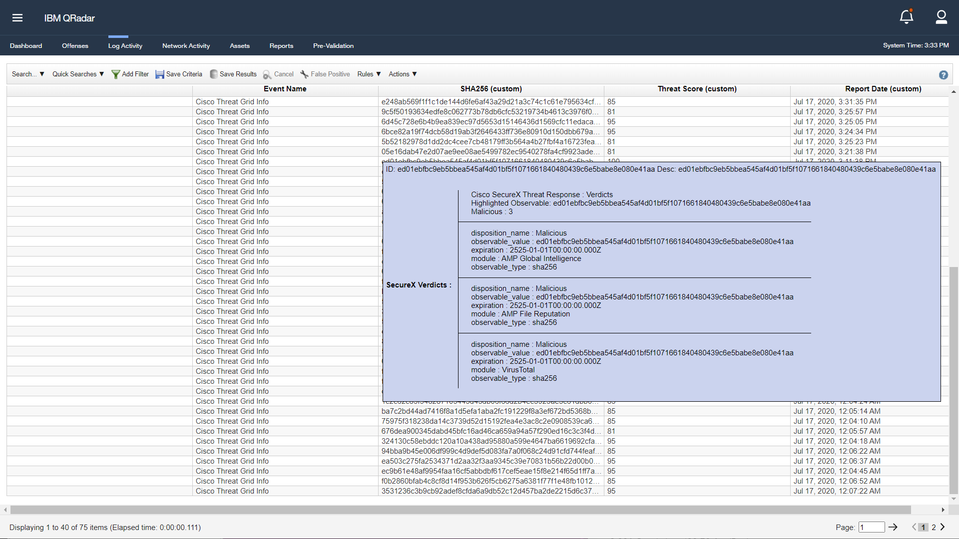 The threat response extension provides the capabilities to right-click pivot from an IP Address in QRadar into an investigation in the Threat Response console and hover over 100+ property field types and query threat response for Verdicts.