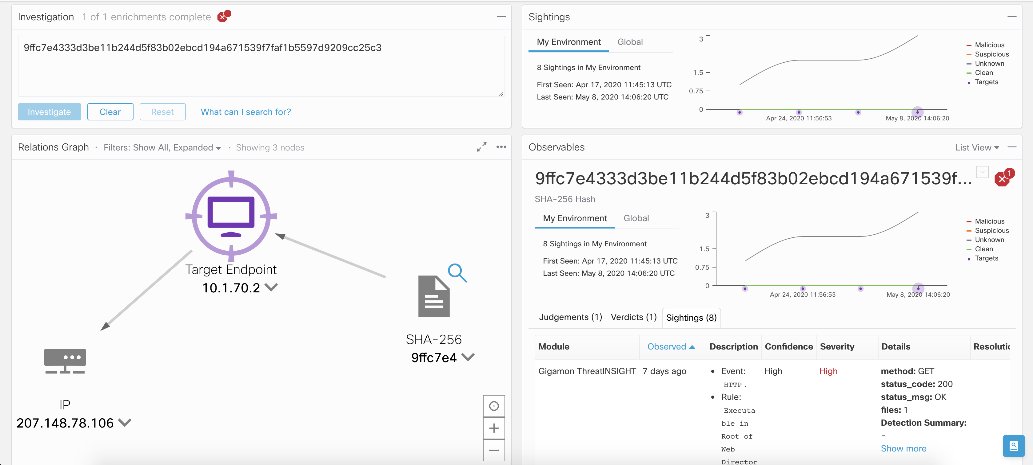 The Gigamon ThreatINSIGHT module enables threat response to query network and threat data for Sightings of observables from the Gigamon intelligence. Gigamon completed the Cisco Compatible Certification for the integration and published a joint solution brief.
