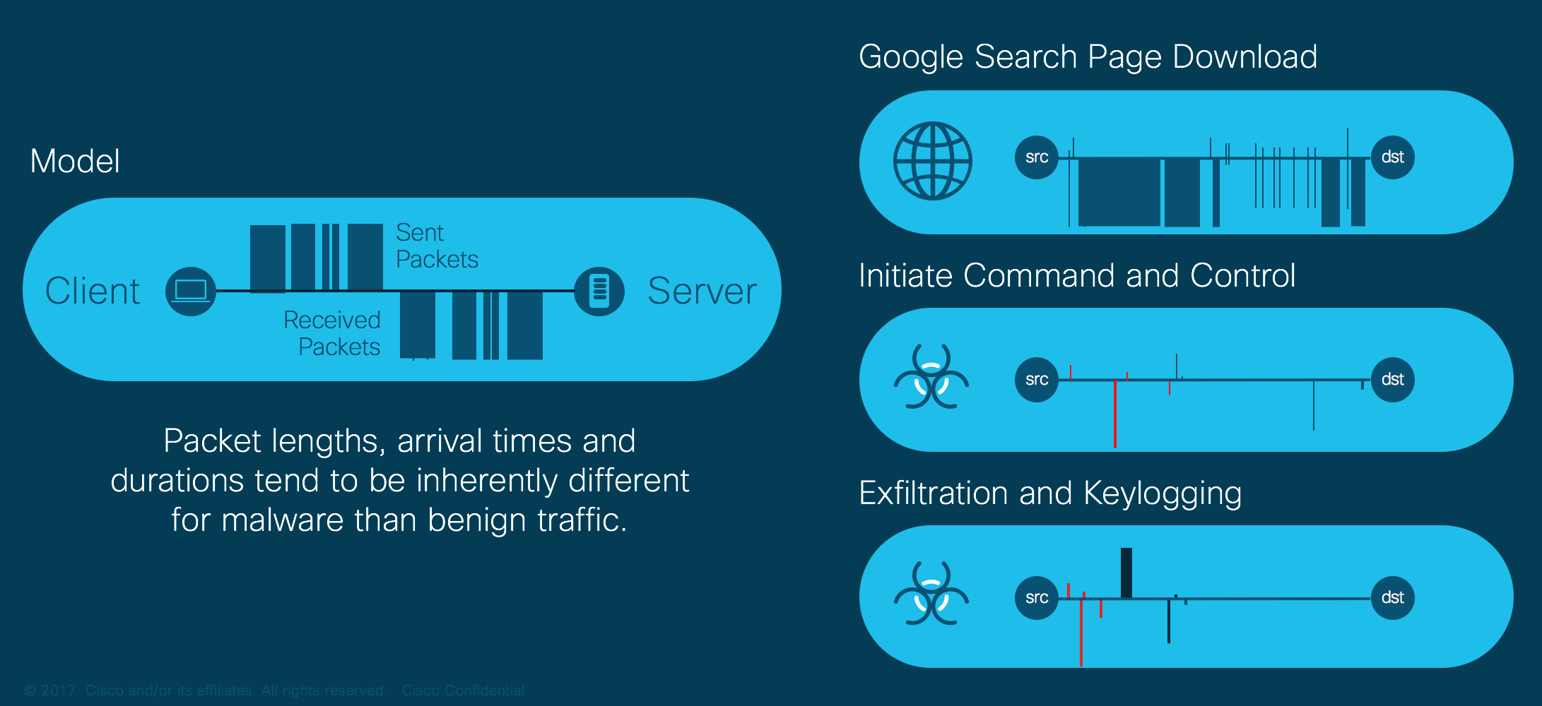 Our answer is based on ETA telemetry produced by a growing range of Cisco routers and switches. ETA telemetry is conceptually very simple. In addition to the normal Netflow export, the switch or router produces additional data fields that add information to specifically address our targeted use cases. The Initial Data Packet (IDP) contains the payload from the first packet of each unidirectional flow. In the case of TLS, the client and server IDP would contain the client and server hello’s, and in the case of HTTP, it would contain the initial request and response. The Sequence of Packet Lengths and Times (SPLT) contains information about the sizes and timing of the connection’s initial packets. This information allows us to differentiate between different categories of communication inside the TLS tunnel, e.g., web browsing, email downloads, file uploads and downloads, and many others. The Netflow and ETA information elements are processed by the on-premise Stealthwatch appliance, but the malware discovery is done in the Cisco cloud.