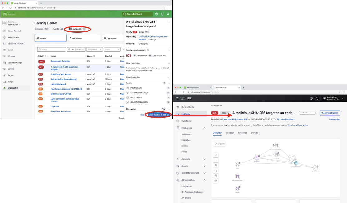 - Providing Meraki administrators, the ability to review, assign, and modify the status of an XDR Incident form within the Meraki dashboard. Incident investigation is enabled via a cross-launch into Cisco XDR