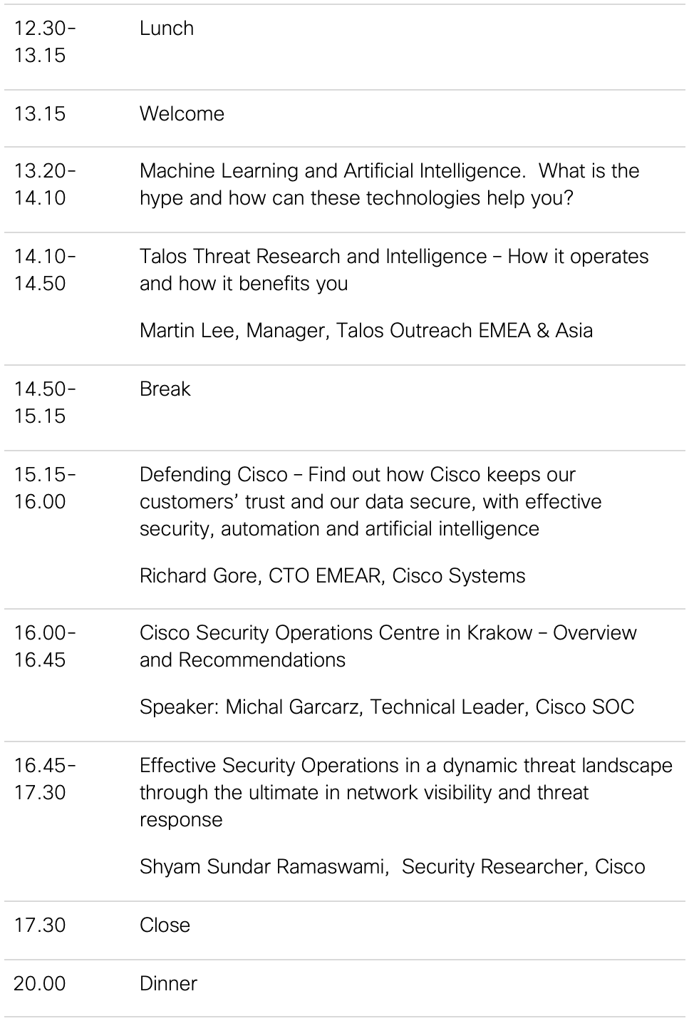The content will focus on threat intelligence and how it is fed into our products in real time to ensure the most effective protection against the latest threats. We will discuss machine learning and AI and how they can help SOC professionals. It will also include insights into the threat landscape, effective defence strategies and experiences and recommendations from Cisco’s own internal Security Operations as well as our European Security Operations Centre.