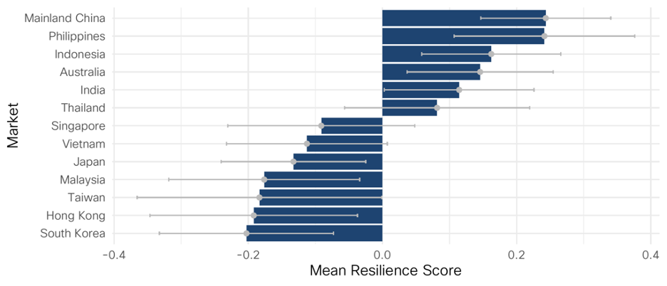 Next, we looked at the mean resilience score for each market in the region: