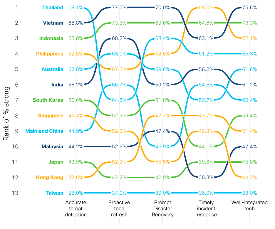 If we look at Thailand, for example, 69.1% of organizations say they are adept at accurate threat detection, while only 28% of organizations in Taiwan say the same. Like in the previous charts, there is a lot of movement between how various markets reported their performance against these practices. However, it’s interesting to note that Taiwan remained consistent.