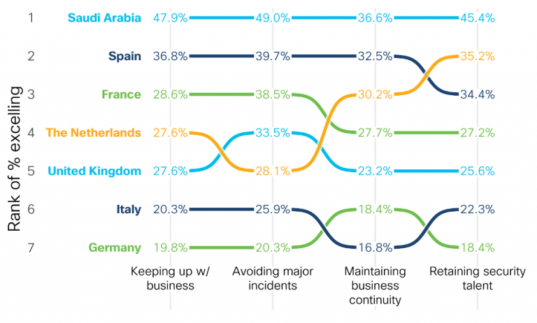 When examining resilience at the country level, however, differences begin to emerge. The next chart shows the proportion of organizations in each country reportedly “excelling” in each of the four outcomes related to security resilience. In other words, about 48% of firms in Saudi Arabia say their security program is doing a great job keeping up with the business. About 37% excel at maintaining business continuity, and so on. So, pick your country of interest and trace its success level across each outcome.