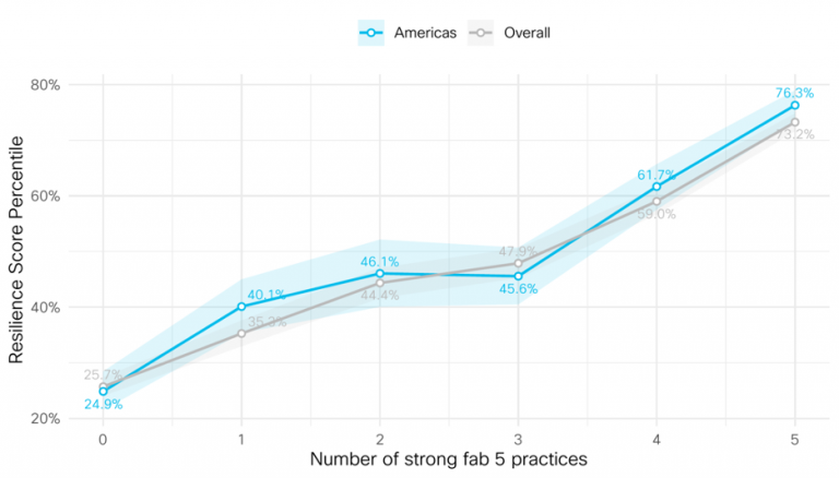 You may be wondering if implementing these five security practices improved resilience across organizations in the Americas. Our study found that organizations in the Americas that do not implement any of these five practices rank in the bottom 25% for resilience, whereas those that reported strength in all five practices rose to the top 25%.