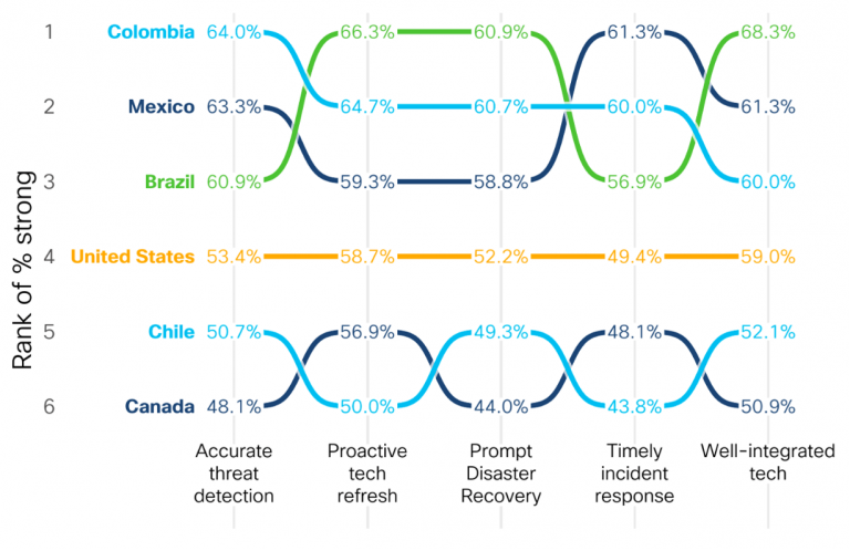So, how did countries in the Americas rank their implementation of these Fab Five practices? If we look at Colombia, for example, 64% of organizations say their capabilities for accurate threat detection are strong, while only 48.1% of Canadian organizations say the same. There is a lot of movement around the top three countries: Colombia, Mexico and Brazil. The U.S. ranks fourth consistently across the board.