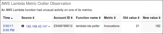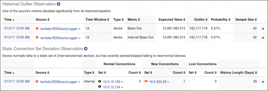 Lambda functions are often “static,” meaning they exhibit a narrow set of predictable behaviors. This makes them a perfect candidate for security analytics, as even minor changes that may indicate a security concern are detectable. In the example below, the RDSQueryLogger Lambda function usually only connects to two internal resources, but it is observed connecting to a third resource.