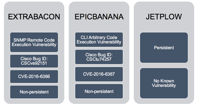 There were three references to exploits that affect Cisco ASA, Cisco PIX, and Cisco Firewall Services Module: EXTRABACON, EPICBANANA, and JETPLOW.