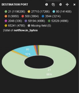 To filter the data shown in Kibana’s dashboards, we can use filters or queries. For example, to only view information about FTP’s control channel (TCP port 21) we can use a querystring of netflow.l4_dst_port:21. Similarly, we can use a filter or query with netflow.protocol:17 to only process UDP flow information. Finally, a filter with Field: netflow.ipv4_dst_addr and Value: 10.0.1.21 will filter on flows that were only destined to 10.0.1.21.