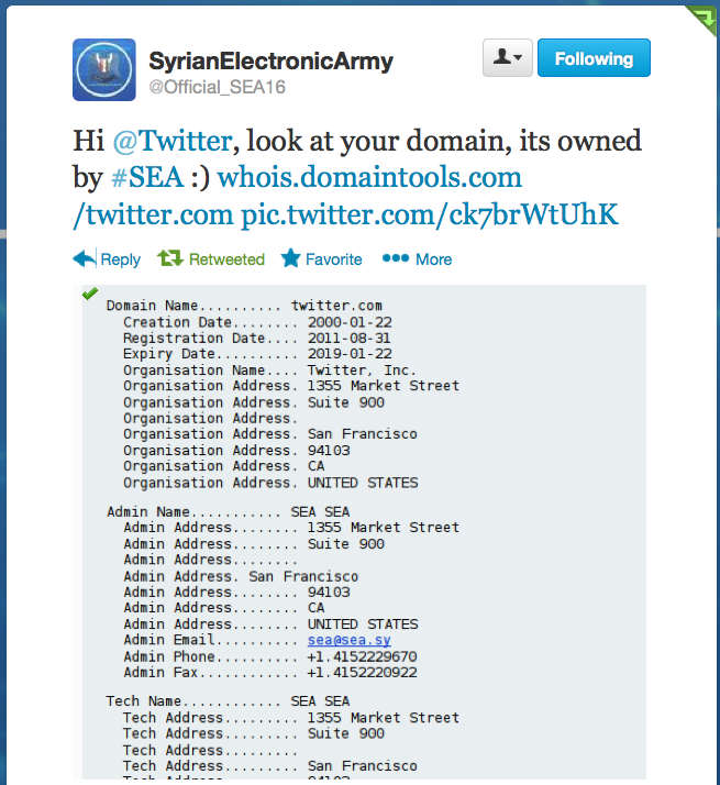 The Syrian Electronic Army continues to hammer away at media organizations. This afternoon the Syrian Electronic Army appears to have compromised the registrar Melbourne IT which hosts the domains of notable media organizations like Twitter, The New York Times, and The Huffington Post.