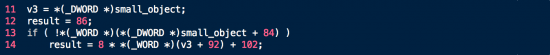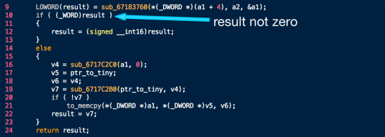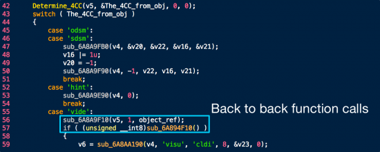 At some point up the call stack, for the first of these two functions, the reference in question is passed to the function QuickTime!0x73e0f0. However, when the stbl atom is missing from the file, or the 4CC is corrupted, the object at eax does not get populated. When this happens the check at line 15 will pass and an error code (0xfffff809) will be passed back down the call stack.