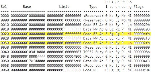 This mixing between 64-bit code and the 32-bit main executable is even difficult for IDA to disassemble. FIgure 2 shows a dump of a Windows 7/8 64 bit Global Descriptor Table (GDT):