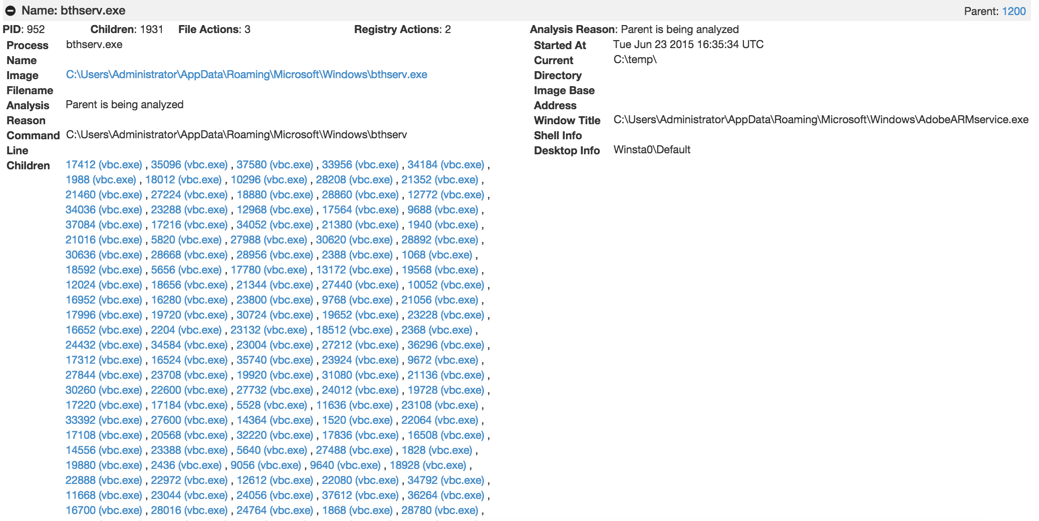 The second process bthserv.exe is designed again to try and mimic legitimate files to avoid detection. This particular file is attempting to pose as bthserv.dll which is the Bluetooth Support Service; a commonly running service on windows systems. It is this process that spawns the malicious activity. As shown above you can see a large amount of child processes with the filename vbc.exe. This process actually spawns close to 500 instances, which it turns out is the DarkKomet RAT. This repeated spawning of a process could has also been used as a sandbox evasion technique, by repeatedly starting services to try and DDoS the sandbox and make analysis difficult. There is a simple mutex identifier that is common to DarkKomet that aids in its detection. The image below illustrates this behavior: