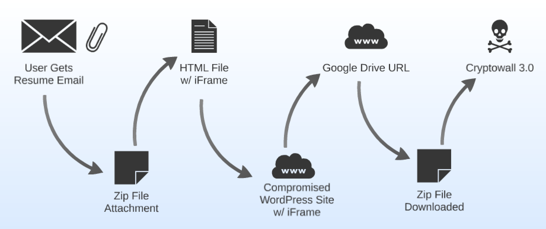 The file stored in Google Drive at this location is named my_resume_pdf.zip. This is where the actual malicious file resides. Inside this zip file is another file that will look something like my_resume_pdf_id_6721-3921-3211.scr. When executed this file is dropping Cryptowall on the system and compromising it. Below is a diagram showing the full infection path.