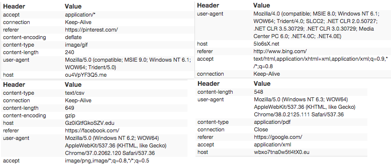Upon execution the Dridex code is injected in Explorer.exe and the original file is deleted. This injected code has C2 capabilities and continues to contact the server. The changes in this variant are primarily associated with this continuing communication and the construction of the HTTP POST requests. The POST header is generated by selecting the User Agent, Content-Type, and Referrer data from a hard coded list, a couple examples of which are below: