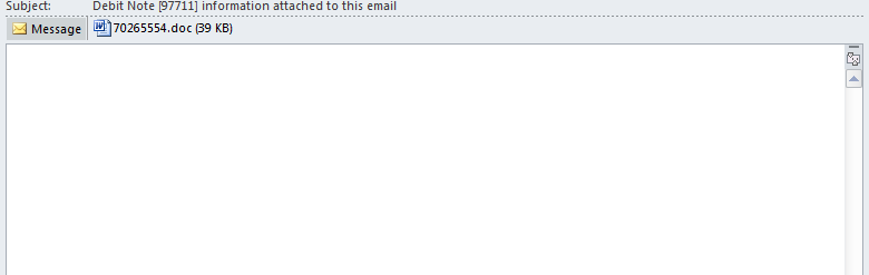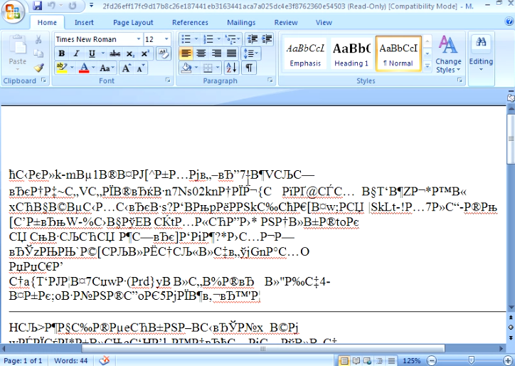 One odd characteristic of this campaign was that the body of the email itself was completely blank. However, if a user did open the attachment they were presented with a word document with no legible text similar to what is shown below.