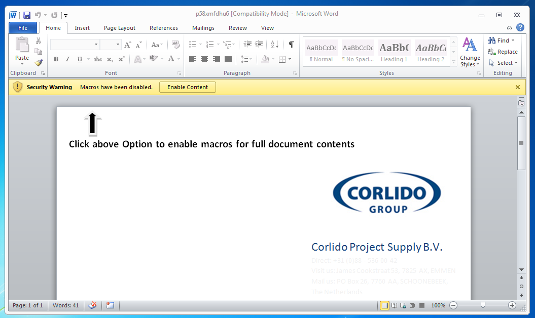 Another characteristic of this attack that was notable is how adversaries went to great lengths to spoof a phishing message that would appear credible to the user. In this attack, an actual business was impersonated, using the logo and physical address of the business, in order to appear legitimate. The bait in this case is a Microsoft Word document containing a macro that downloads and executes a binary from hxxp://frontlinegulf[.]com/tmp/adobefile.exe.